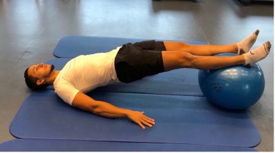 - Couchez-vous sur le dos, les mollets en appui sur un ballon Suisse.